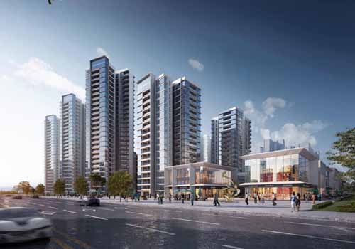 1KM范圍內(nèi)大型商業(yè)密集,項目最大限度的節(jié)地及充分利用水系景觀,把商業(yè)做成高層商業(yè),提升商業(yè)價值。